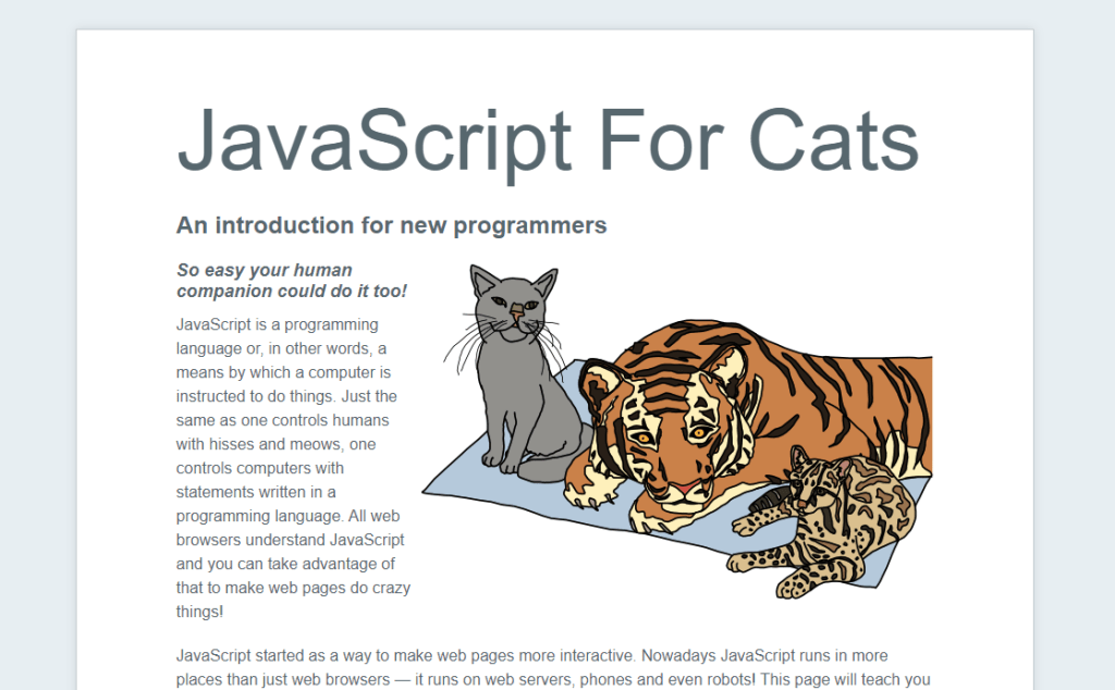 JavaScript for Cats has a simplistic and funnier approach to JavaScript. It gives you a basic intro to JavaScript, advertising it’s “So easy your human companion could do it too” to cats. After you finish the short course, it gives you other ways to learn more advanced JavaScript.